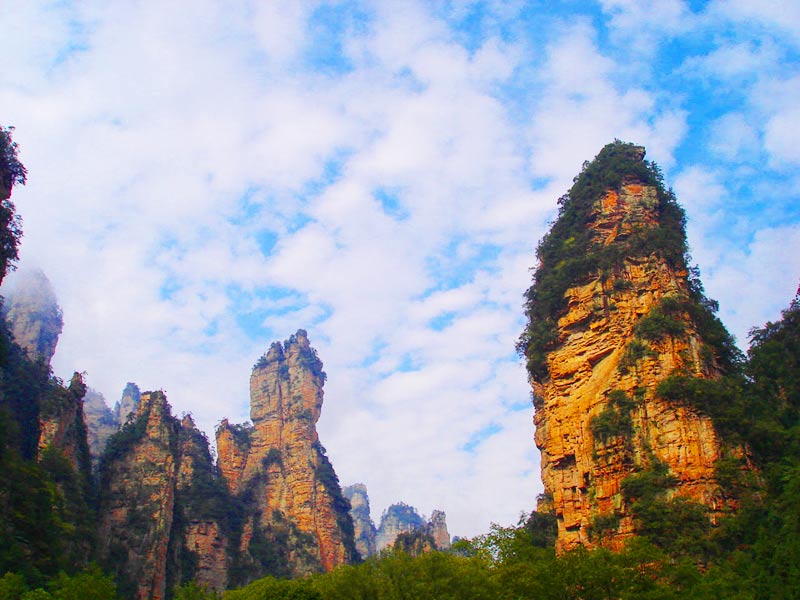 天門山國家森林公園四面絕壁,雄偉壯麗。保存著完整的原始次生林,植物資源豐富,有世界罕見的高山珙桐群落。天門山文化底蘊深厚,留有大量贊詠天門山的詩詞,更有眾多神聞傳說,被譽為“張家界之魂”。山頂天門山寺自唐朝建成以來香火鼎盛,寺外有七級浮屠,掩映于青枝綠葉中,古雅幽清。善男信女入寺拜佛,撞鐘響徹天際,擊鼓震動山岳,香煙裊裊如云。明萬歷年間南岳僧在此傳經(jīng)授戒,從此聞名遐邇,朝山拜佛者達周邊四郡十余縣,信士遍及湘西北,天門山因此成為 “湘西第一神山”。天門山終年云霧繚繞,云海景象變化無窮。山間溶丘、石芽廣布,奇石秀木及珍禽異獸繁多,更有飛瀑流泉噴涌而出。天門山兼峰、石、泉、溪、云、林于一體,集雄、奇、秀、險、幽于一身,被譽為空中原始花園。天門洞、天縫渡仙、五指山、將軍石等是有名的峰林景觀,還有神秘的千佛洞等待你的探奇;山間的韓家溝則是富蘊滿族風情的村落——這里久居的幾十戶滿族農(nóng)家至今仍完好保留著其在語言、飲食、衣著、居住以及婚慶殯葬等方面的滿族風俗,是難得的民俗文化旅游地。
