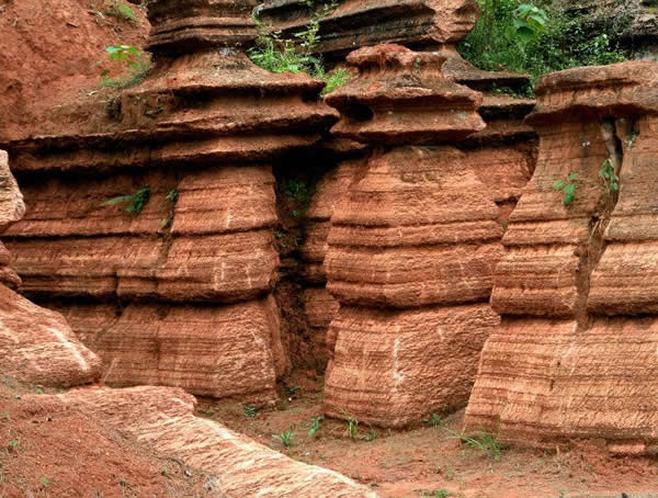 這些石柱不但顏色各異,而且大小不等。有的高達(dá)七、八米,而有些則像半埋于地下的巨獸骨架。一位村民告訴記者,現(xiàn)在石林沒有以前壯觀,都長渣子(灌木)了。原因是由于山頂樹木減少,雨水將泥土帶下山,很多石頭都被埋在土下,后來這些地方都開墾了農(nóng)田,石林也被永久覆蓋。