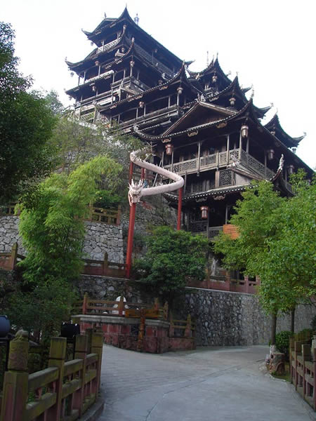 九重天世襲堂是土家風(fēng)情園的精華和靈魂所在。該建筑由土家民間藝人李宏進(jìn)設(shè)計(jì),依80度陡坡而建,高48米,共9重12層,整個(gè)樓房全部用木栓連接,沒有一顆鐵釘,堪稱土家族建筑史上的奇跡。2002年9 月22日,九重天吊腳樓被載入世界吉尼斯世界紀(jì)錄,認(rèn)定其為目前中國最大、最高、最完美的木質(zhì)結(jié)構(gòu)吊腳樓。2001年4月6日,朱镕基總理視察土家風(fēng)情園時(shí),對(duì)九重天贊不絕口:“一批民間匠人能造出這樣輝煌的吊腳樓,而且還解決了力學(xué)的問題,真是不簡單。”清華大學(xué)著名建筑學(xué)家何重義先生說:“張家界土家風(fēng)情園完全可以和蘇州的園林相媲美。特別是九重天世襲堂,猶如玉宇瓊閣,令人神往!”古人說,天有九野,地有九州,土有九山,山有九寨。古人又把九重叫做天,說天有九重,最上一重是上帝和君主居住的地方,所以我們叫它“九重天”。