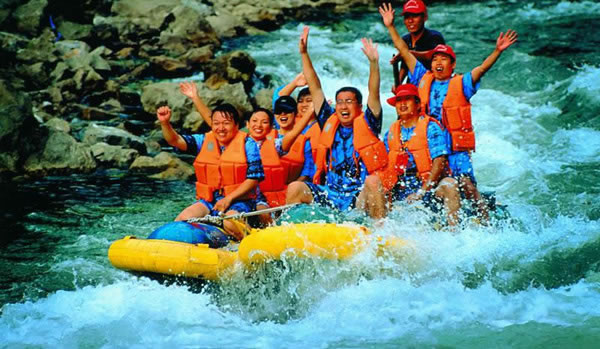 將離開王村之際,導游說猛洞河就在王村附近,不如去漂流一番。這個提議得到了大家的熱烈擁護:早就聽說過猛洞河“天下第一漂”的美名,怎么可以迎面錯過?于是揮師猛洞河,不過因為是臨時決定,時間上比較緊張,我們必須在兩個小時內(nèi)完成漂流——據(jù)說這是項不可能完成的任務。
