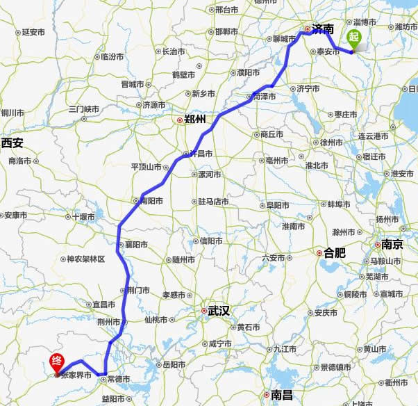左右,沿途經過沂源縣——濟南——東平縣——菏澤市——蘭考縣——許昌市——平頂山——南陽——襄陽——荊門——荊州——常德(也可以走國道經澧縣、石門縣)——慈利——張家界。