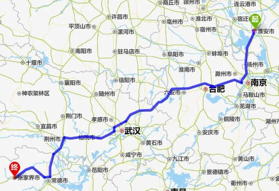 左右,沿途經過淮陰——揚州市——滁州市——合肥——六安市——麻城市——仙桃市——潛江市——荊州市——常德市(這里可以不走常德,直接從荊州經澧縣、石門縣到慈利縣)——慈利縣——張家界。