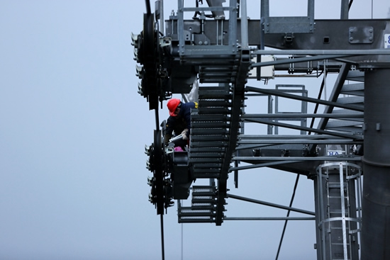 圖為正在對天子山索道進(jìn)行巡檢的工作人員